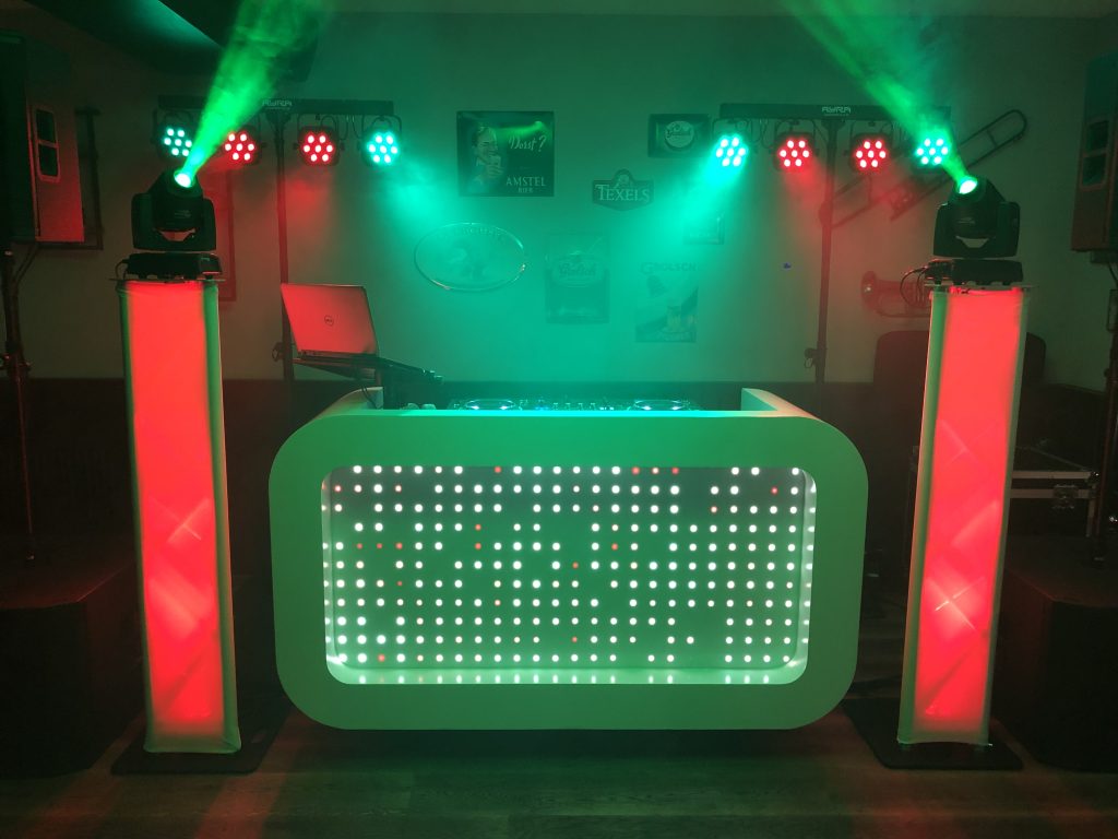 Sommige zalen hebben niet zo’n hele mooie wand waar ik met de DJ Booth tegenaan kan staan.